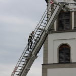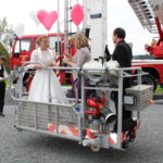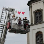 Als Feuerwehr ist es unsere Pflicht, unseren Kameraden mit einem Spalier, geformt aus Schläuchen, zu begrüßen. Mit unserem Steiger wurde die Braut in die Höhe entführt und konnte nur gerettet werden, indem Florian über den Leiterpark in den Korb aufstieg. Anschließend fand eine wunderbare Agape auf dem Kirchplatz in Bildstein statt.