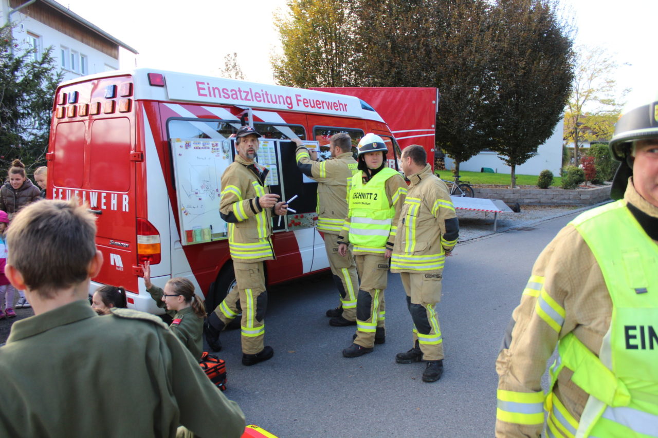 Um 16:00 Uhr fuhr dann die aktive Mannschaft der Ortsfeuerwehr zum Übungsobjekt an. Aufgrund eines Brandausbruches im Keller kam es zu einer starken Verrauchung im gesamten Stiegenhaus. In weiterer Folge geschah an der Kreuzung aufgrund von Unachtsamkeit zu einem Unfall in den zwei PKW verwickelt waren.
