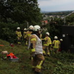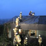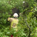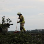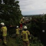 Heftige Windböen ließen in der Schloßgasse einen Baum umstürzen. Unglücklicherweise landete dieser auf dem danebenliegenden Haus. Beim Sturz auf dieses rissen die Äste ein großes Loch in die Dachhaut des Wohngebäudes. Mit Kettensägen und Seilen wurde der Baum vom Dach entfernt und in kleine Stücke zerlegt. Da kein Dachdecker erreicht werden konnte, schützten wir das Dach mit Planen und Sandsäcken vor dem nächtlichen Regenschauer, welcher jedoch viel zu früh eintraf und uns während des Einsatzes erwischte.