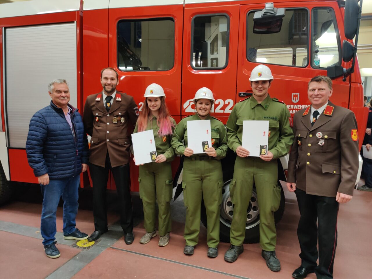 Die Prüfung zum Feuerwehrjugend-Leistungsabzeichen in Gold fand diese Jahr am 23.11. beim Landesfeuerwehrverband statt. Es handelt sich dabei um das höchste Abzeichen, welches in der Feuerwehrjugendkariere erreicht werden kann. Ben Rohner, Leonie Mangele und Tina Riemer konnten die Prüfungen bestehen und dürfen nun das Goldene Abzeichen tragen. Bei der Schlussveranstaltung wurden die Abzeichen von Landesrat Christian Gantner, dem Landesfeuerwehrinspektor und den Bezirksjugendreferenten verliehen. Um zur Leistungsprüfung anzutreten, mussten einige Voraussetzungen erfüllt werden. Neben positivem Wissenstest in Gold, Teilnahme am Wettkampf und 16-stündigem Erste-Hilfe-Kurs muss man auch noch mindestens 15 Jahre alt sein. Die Prüfung selbst bestand aus theoretischen und praktischen Aufgaben, die gemeinsam oder alleine gelöst werden mussten. Richtiges Absichern einer Unfallstelle gehörte genauso dazu wie eine Löschleitung zu erstellen und Gerätschaften richtig zu ordnen. Bei den Theorie-Übungen wurde ein Planspiel durchgeführt und einige Fragen mussten beantwortet werden.