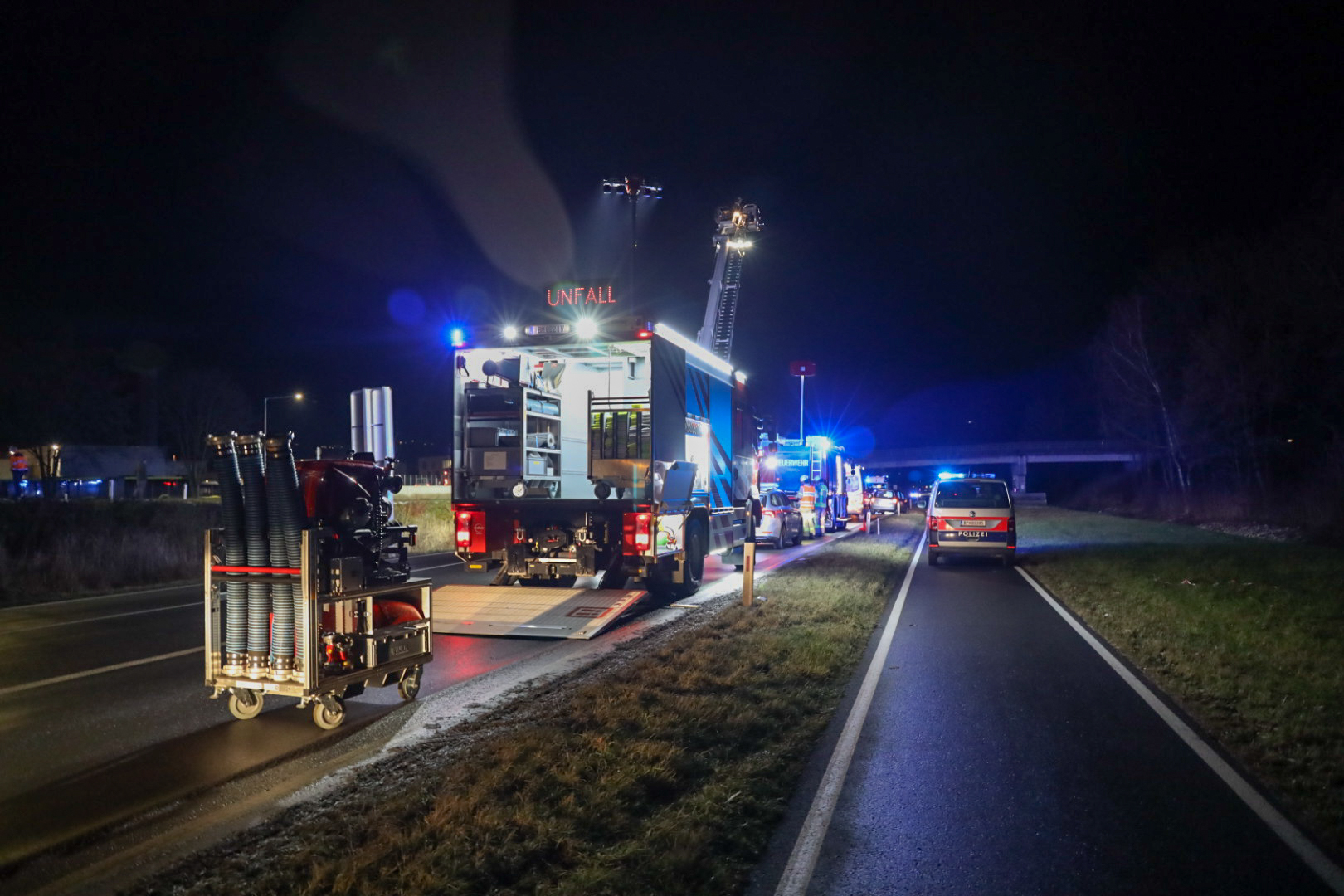 Auf der L190, auf Höhe der Salzsilos, ereignete sich ein Verkehrsunfall mit drei leicht verletzten Personen. Ein PKW geriet auf die Gegenfahrbahn und touchierte ein entgegenkommendes Fahrzeug. Die Verletzten wurden von der Rettung in die Krankenhäuser Dornbirn und Bregenz gebracht. Unsere Aufgaben bestanden darin, die Unfallstelle abzusichern und zur Unfallaufnahme der Polizei auszuleuchten. Anschließend zogen wir mittels Seilwinde ein Fahrzeug aus dem Graben und unterstützten den Abschleppdienst beim aufladen. Nach der Reinigung der Fahrbahn konnte diese wieder für den Verkehr freigegeben werden. Die L190 war in diesem Bereich für etwa 2 Stunden gesperrt.