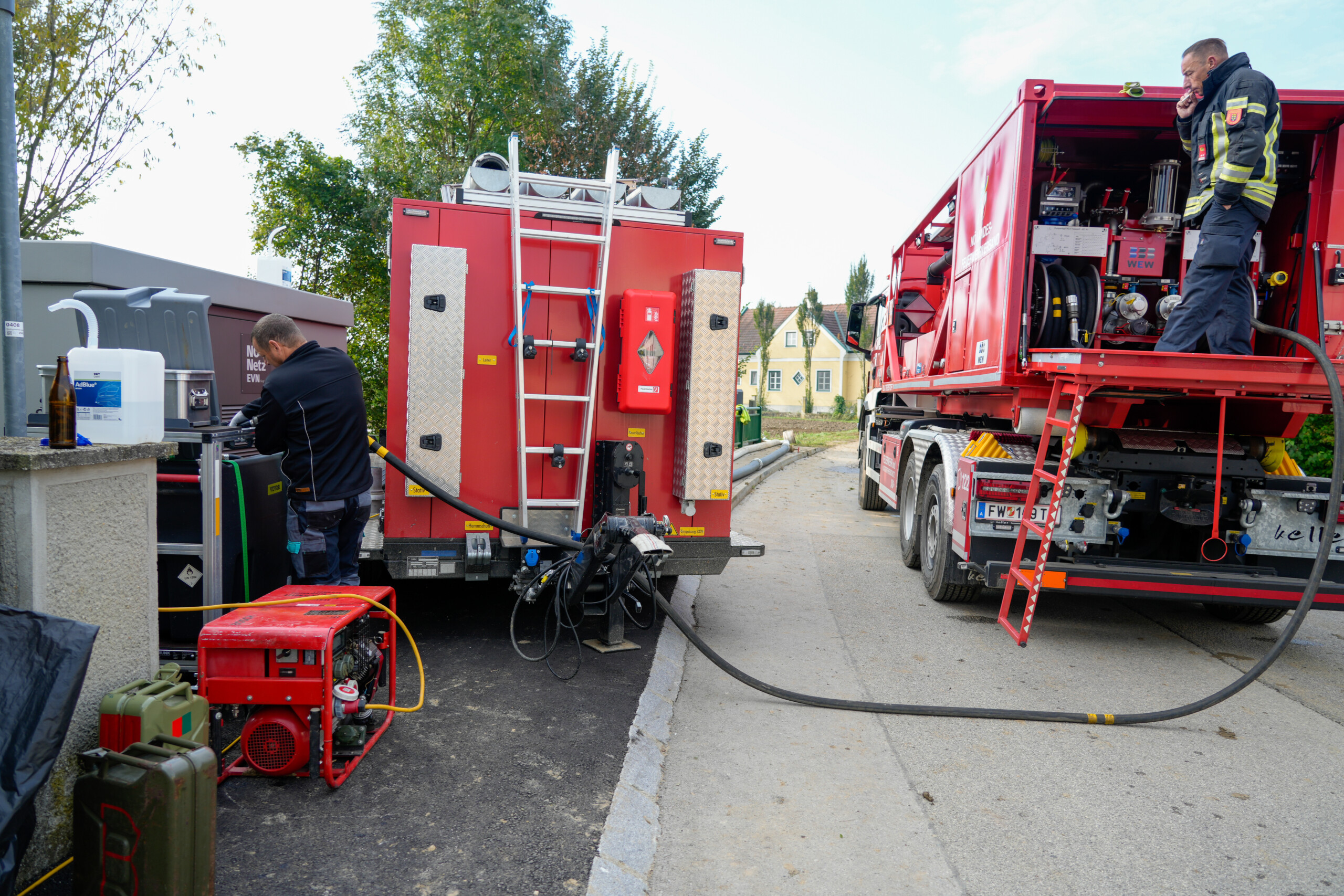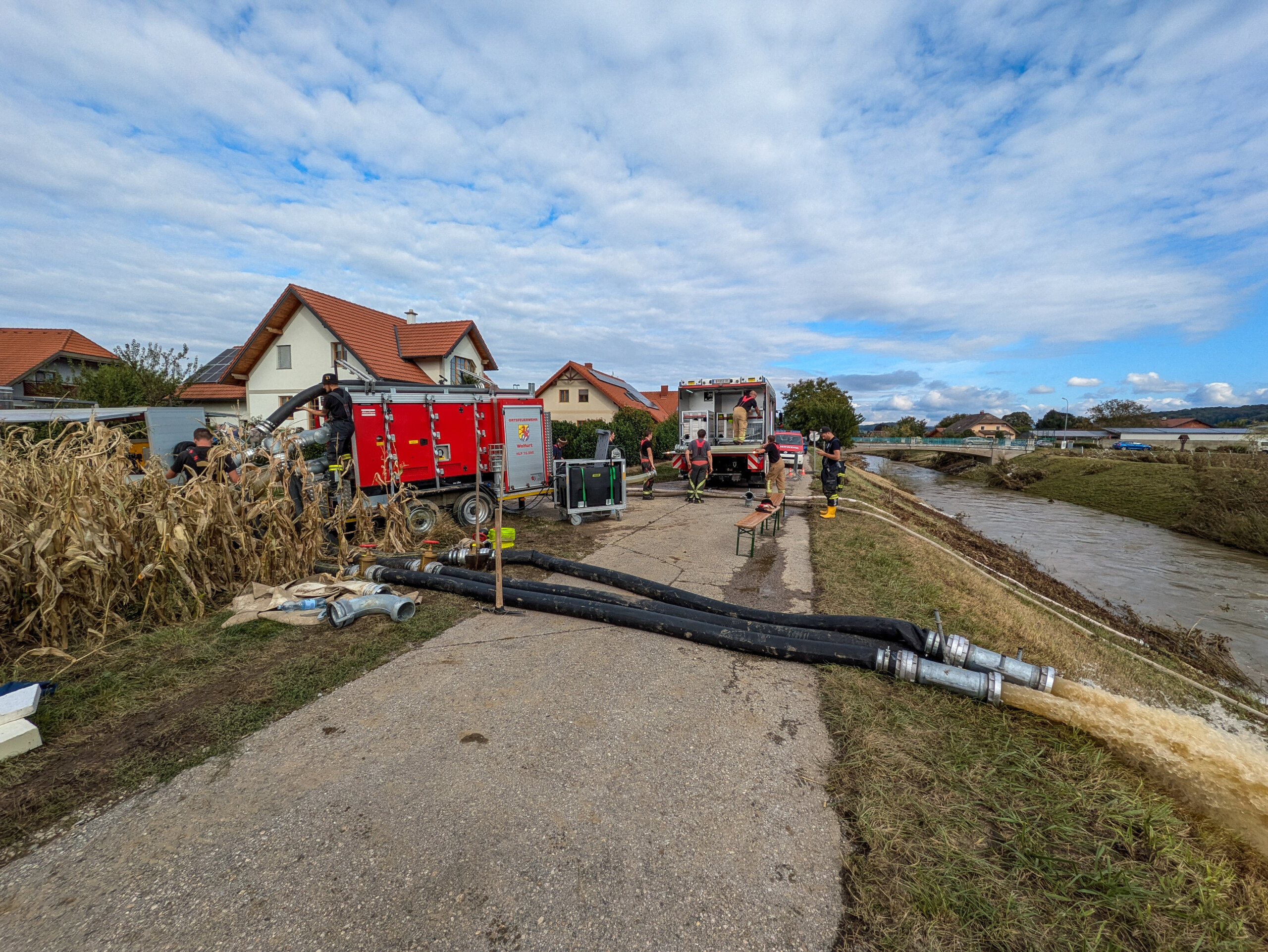 Am Mittwoch wurden wir nach Asparn entsendet, das aufgrund eines Dammbruchs großflächig unter Wasser stand. Mit unseren zwei Hochleistungspumpen, von denen eine 16.000 Liter und die andere 8.000 Liter pro Minute fördert, pumpten wir große Wassermengen in einen nahegelegenen Fluss. Dies führte zu einer signifikanten Senkung des Wasserpegels in der gesamten Ortschaft.