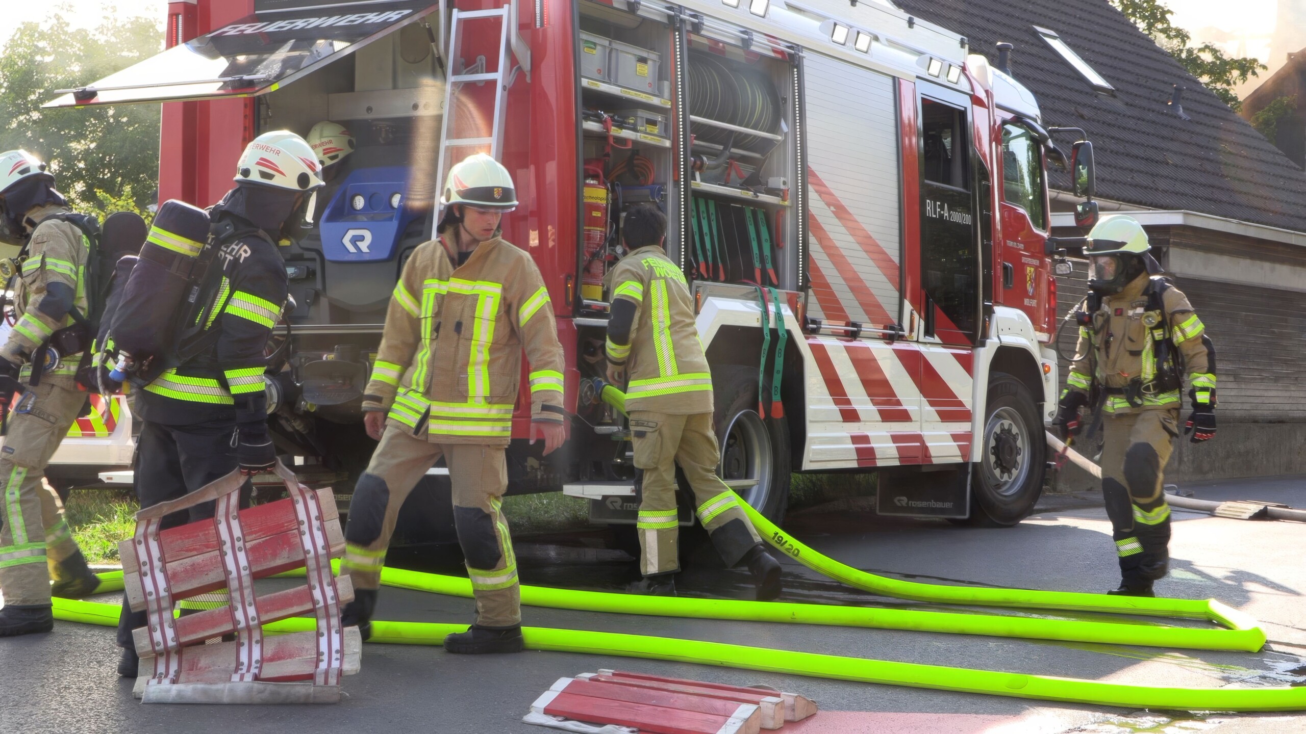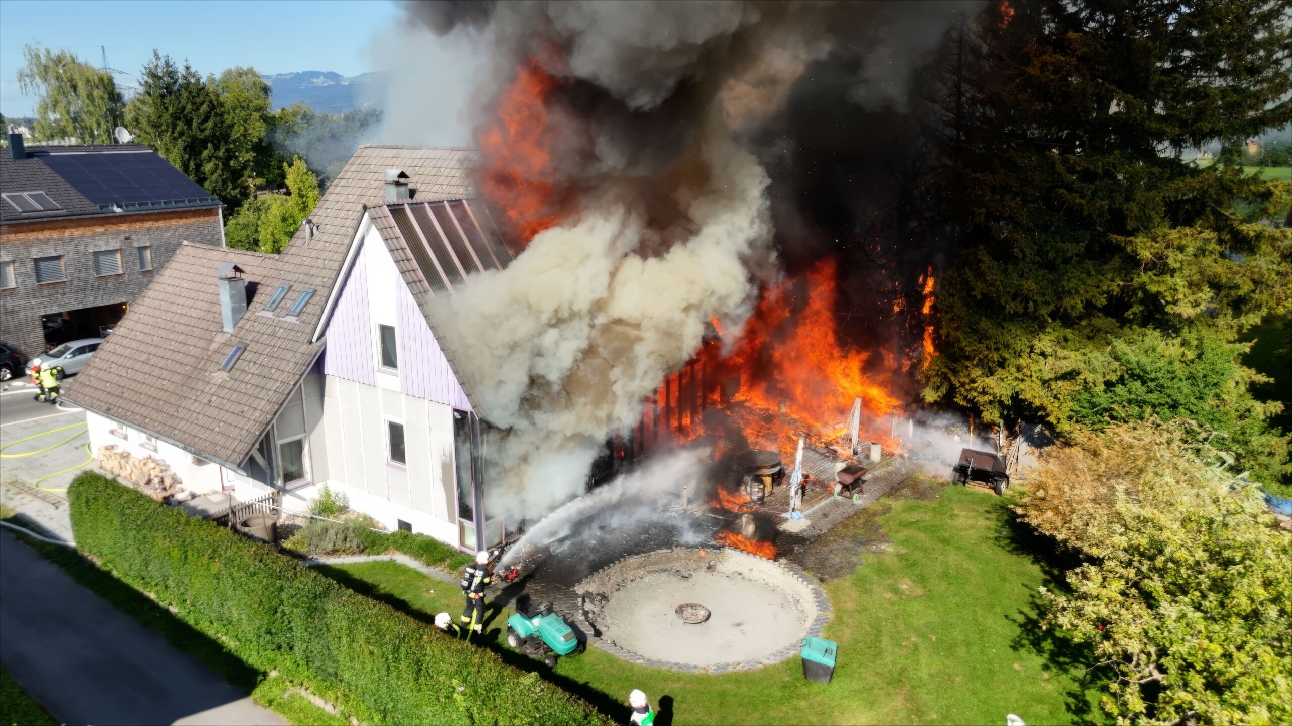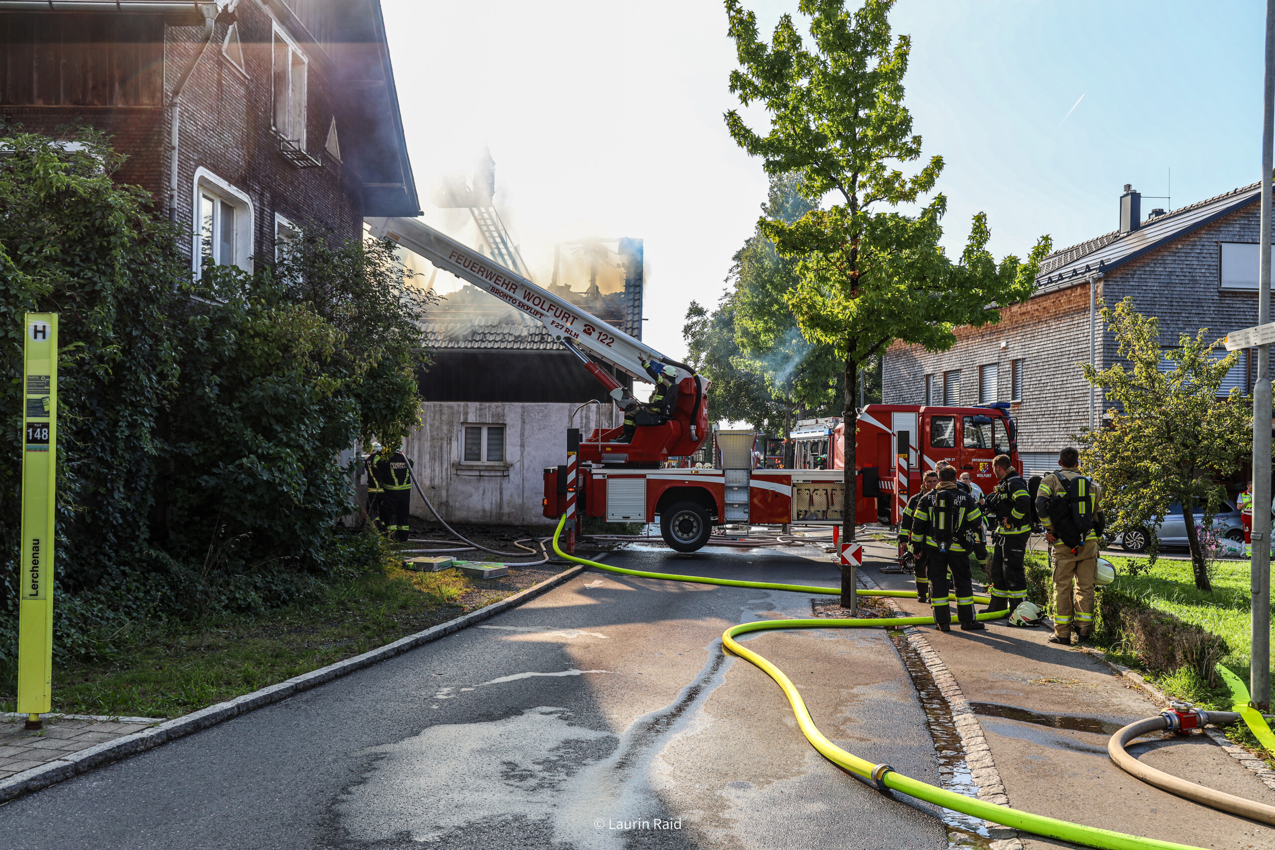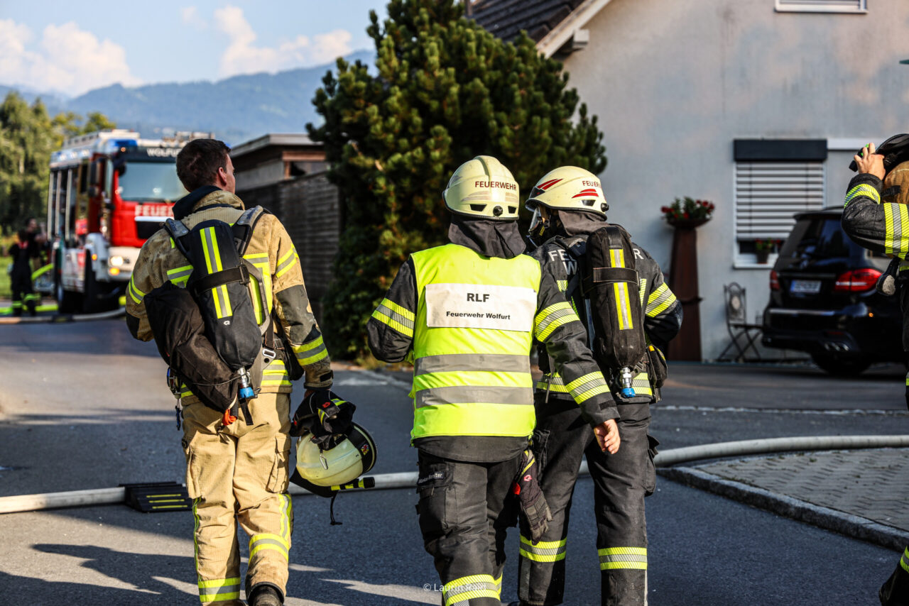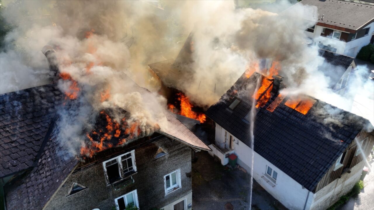 Beim Eintreffen unserer Mannschaft standen drei Gebäude bereits in Vollbrand. Unsere Wehr unterstützte die Feuerwehr Lauterach mit vier Atemschutztrupps im Innenangriff der betroffenen Gebäude. Zusätzlich wurde mit unserem Steiger die Dachbereiche abgelöscht und anschließend geöffnet, um eine effektive Brandbekämpfung zu ermöglichen.