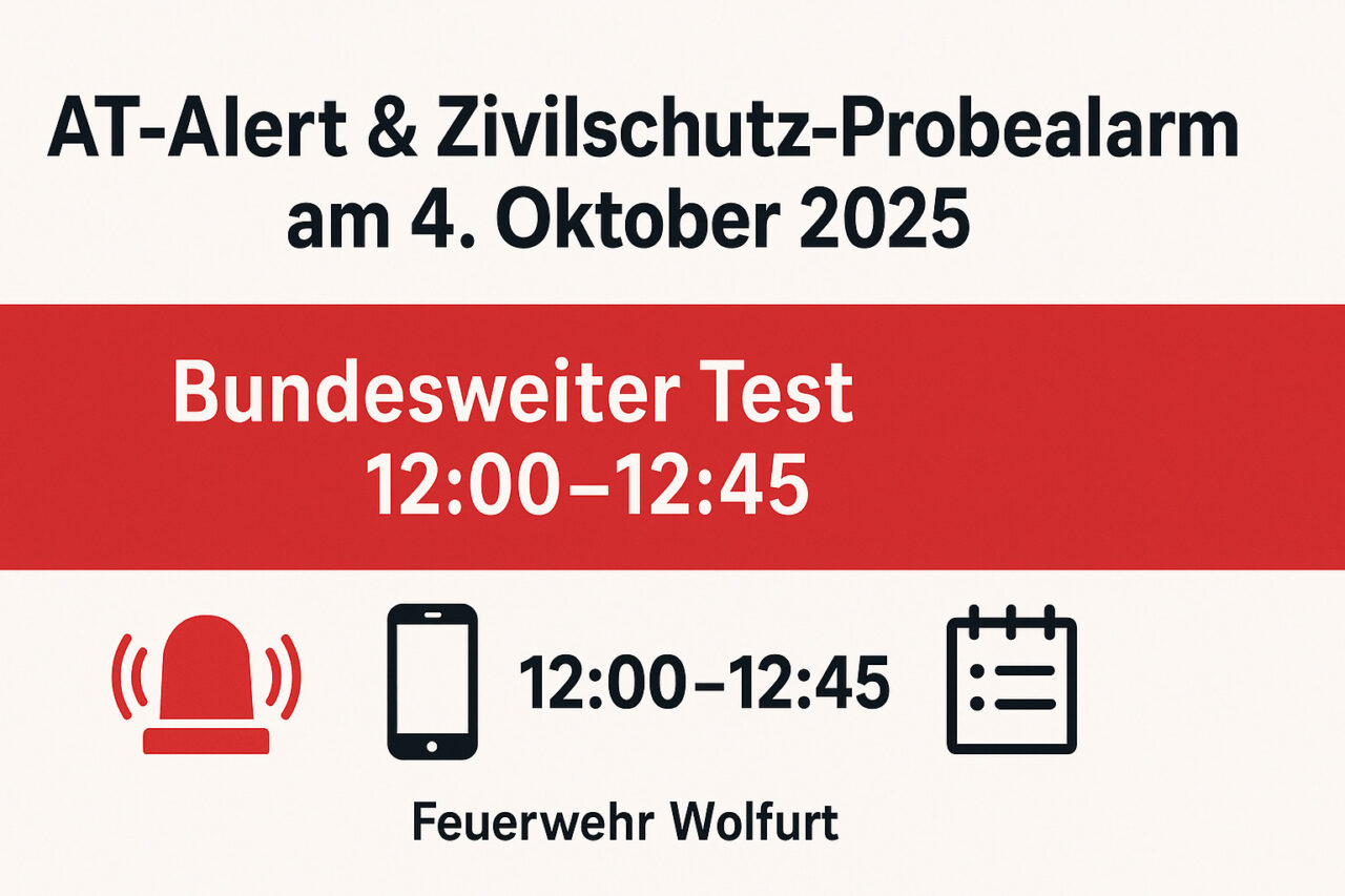 Am Samstag, 4. Oktober 2025, findet in ganz Österreich der jährliche Zivilschutz-Probealarm statt. Zwischen 12:00 und 12:45 Uhr werden die Sirenensignale in festgelegter Reihenfolge ausgelöst. Zusätzlich wird heuer das Bevölkerungswarnsystem AT-Alert (Cell Broadcast) bundesweit getestet – es können also Warnmeldungen direkt auf euren Mobiltelefonen aufscheinen. Es besteht keine Gefahr – es handelt sich um einen bundesweiten Funktionstest.