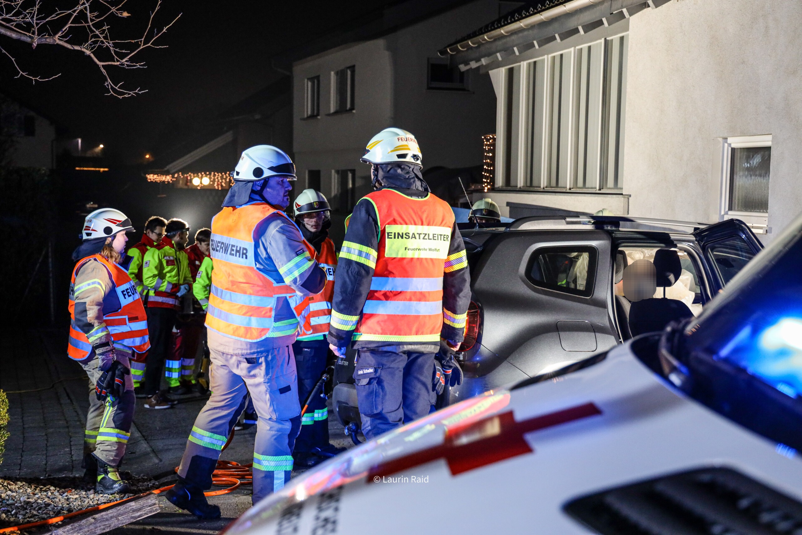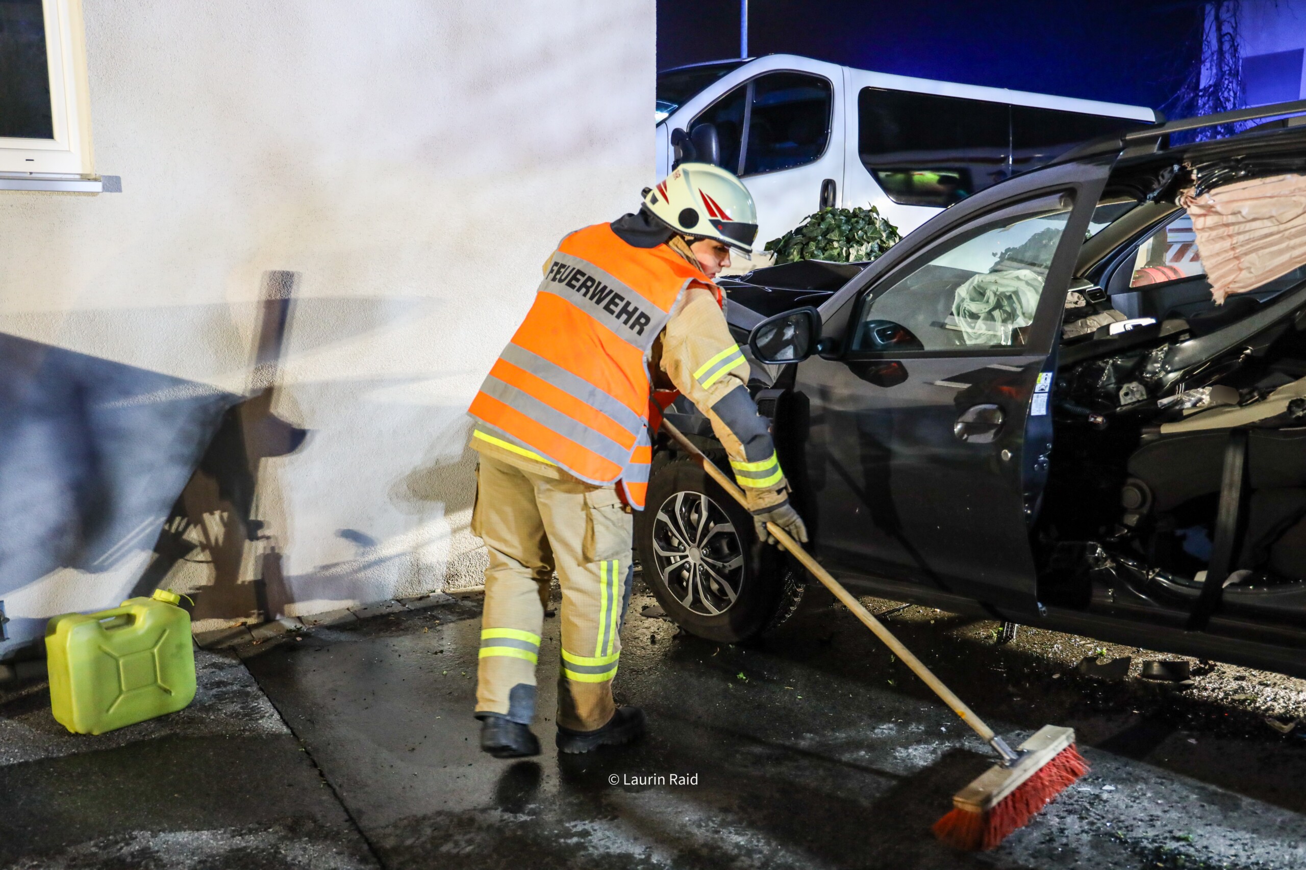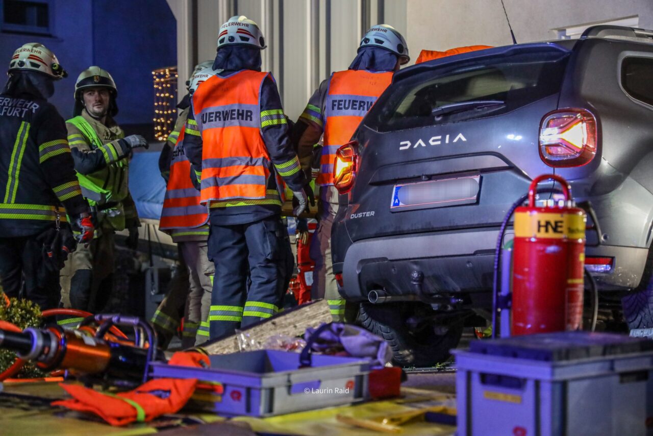 Die Feuerwehr Wolfurt wurde am Donnerstagabend zu einem Verkehrsunfall in der Wälderstraße alarmiert. Ein PKW war von der Fahrbahn abgekommen und frontal in eine Hauswand geprallt. Der Fahrzeuglenker war nicht eingeklemmt, jedoch wurde in Absprache mit dem Notarzt eine schonende Rettung über eine große Seitenöffnung durchgeführt, um mögliche Wirbelsäulenverletzungen nicht zu verschlimmern.