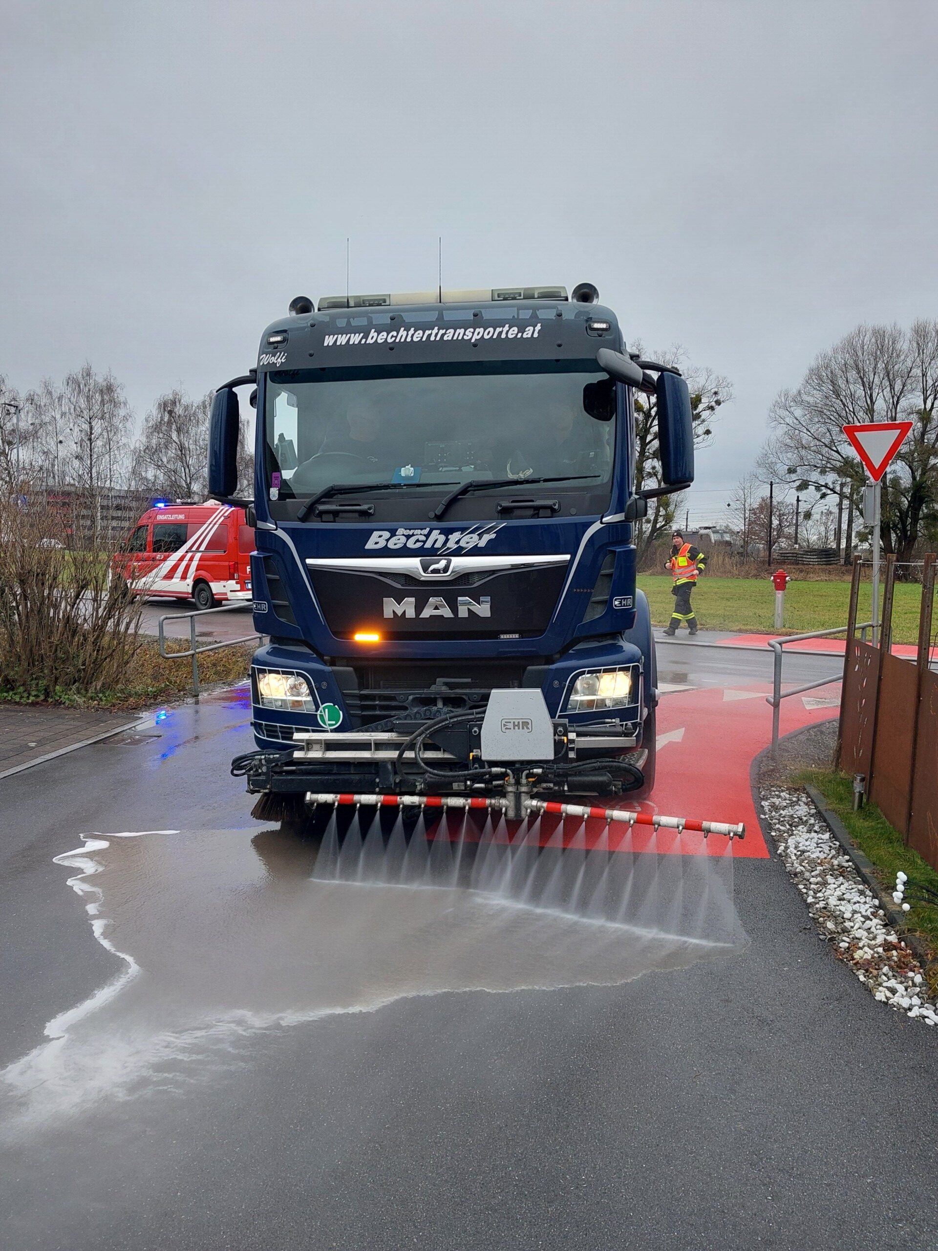 Das ausgelaufene Öl im unmittelbaren Bereich des Fahrzeugs wurde mit Ölbindemittel aufgenommen. Die restliche Ölspur wurde mit Bioversal behandelt und anschließend mithilfe einer Kehrmaschine gründlich gereinigt.