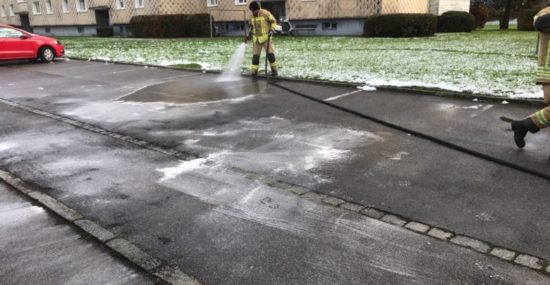 Aus einem geparkten Fahrzeug kamen mehrere Liter Motoröl aus, welches sich, aufgrund der nassen Verkehrsfläche, über den Parkplatz und einen…