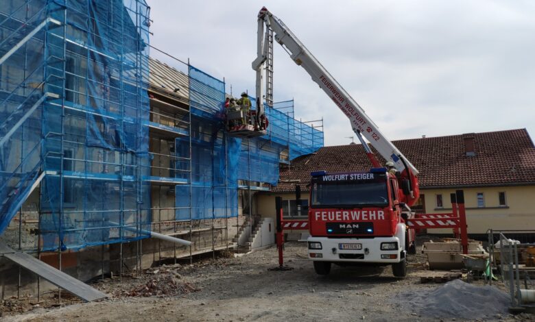 Ein Bauarbeiter stürzte auf einer Baustelle in Lauterach schwer und wurde mittels Steiger aus der Höhe schonend der Rettung übergeben.